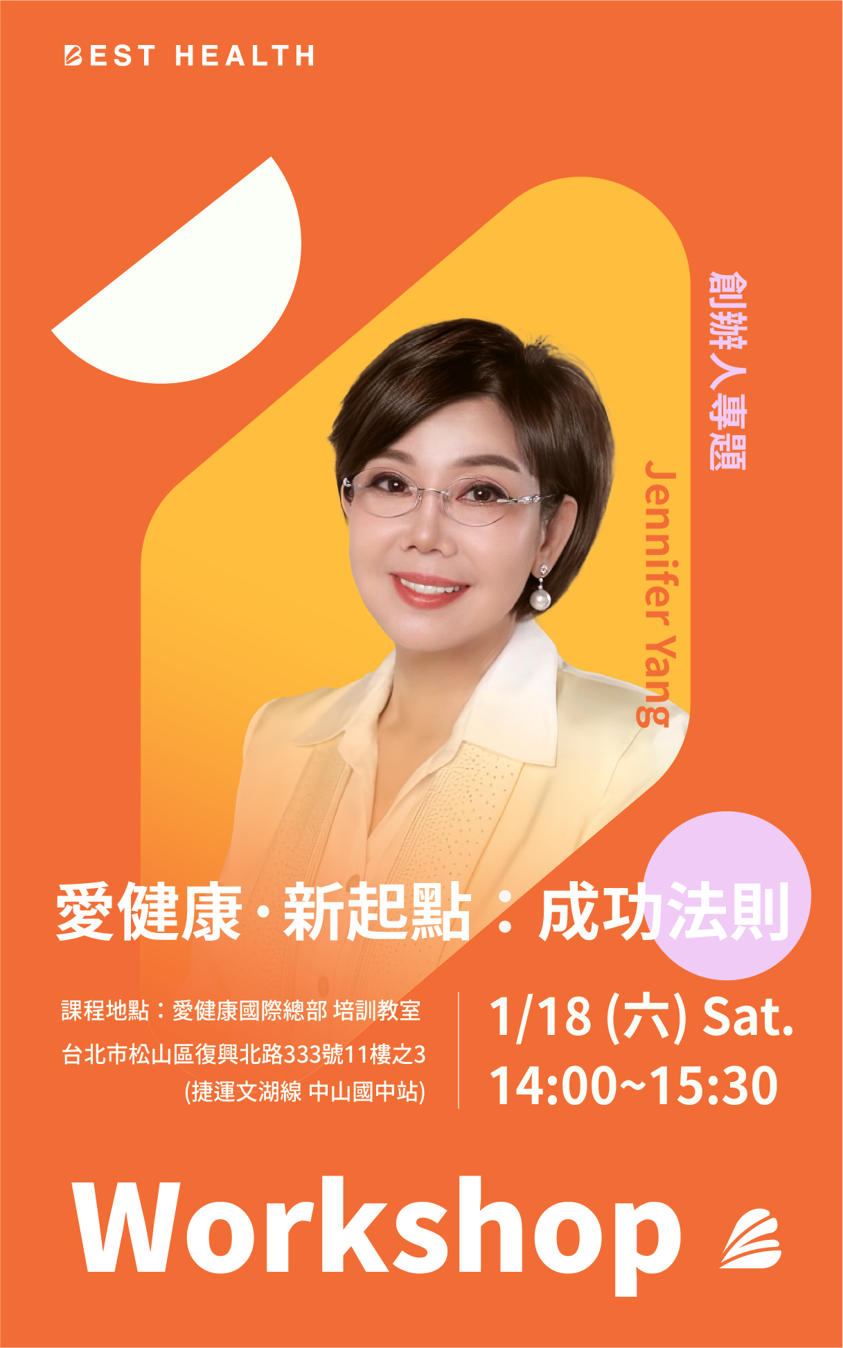 執行長Jennifer將與我們分享她如何跨越挑戰、重拾健康,以及如何透過改變生活方式來創造屬於自己的全新起點。